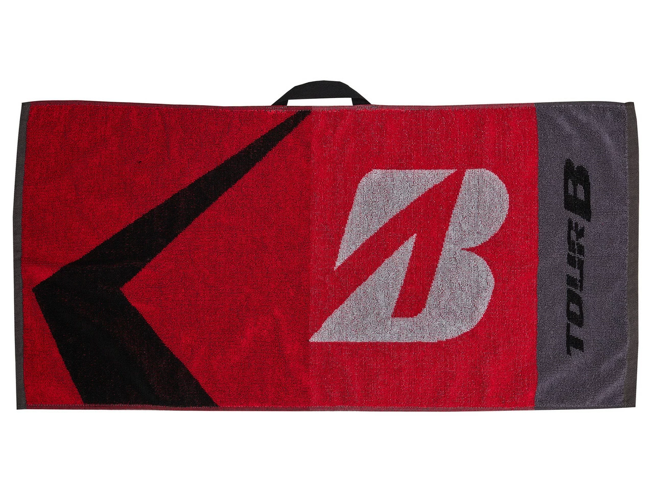 Buy Bridgestone Staff Towel – Red/Black online at GolfBox. Double Sided 100% Cotton. Large 40.64 cm x 81.28 cm Surface Area. Fabric Strap to Secure Towel on Clubs or Golf Bag. Bridgestone Tour B Logo