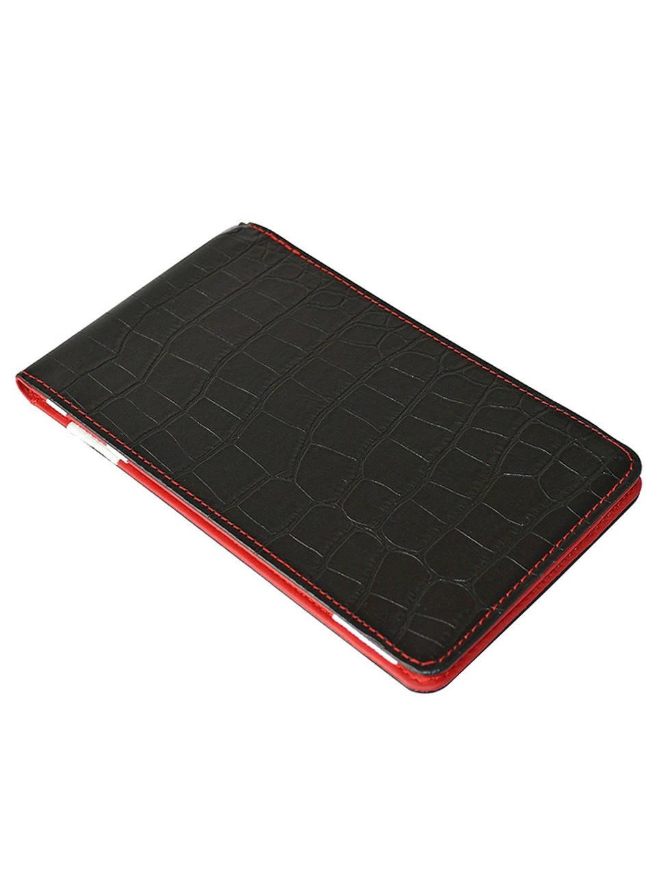 Buy On Par Scorecard Holder Croc Print Black/Red online at GolfBox. Crocodile leather effect. Durable faux leather outer cover. Holds most scorecard sizes and includes a link to unlimited printable golf game trackers sheets. Course guide holder and Pencil holder. Size 18.5 x 11cm