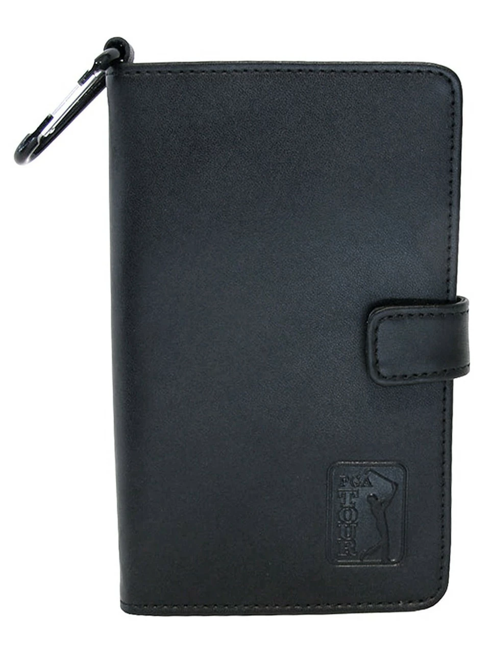 Buy PGA Tour Leather Scorecard & Accessory Holder online at GolfBox. Manufactured from high quality leather with popper stud fastening. Straight gate carabiner bag clip. Stainless steel divot tool, pencil, 4 x wooden tees & ball marker. Scorecard template