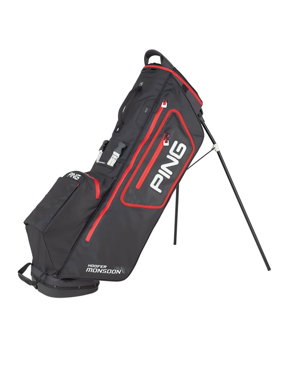 Buy Ping Hoofer Monsoon Stand Bag – Black/Scarlet/White online at GolfBox. 5-way top. 6 pockets with 20L pocket volume. Water-repellent construction. Rain hood inside zippered hip pad. 4 seam-sealed pockets